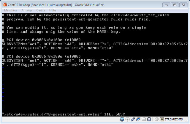 Der erste Eintrag war vom Originalbild, also entfernte ich ihn. Gehe nun zurueck zu /etc/sysconfig/network-scripts/ifcfg-eth0 und fuege die korrekte Hardwareadresse mit dem Parameter HWADDR hinzu. In meinem Fall HWADDR="08:00:27:50:5e:77". Es war wichtig, dass die Adresse in Anfuehrungszeichen angegeben wird; ohne sie wuerde es nicht funktionieren. Ja, das hat einige Zeit gedauert herauszufinden.