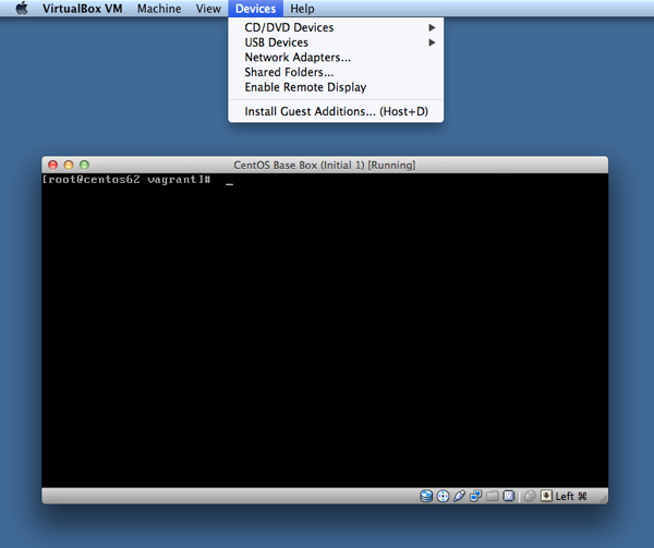 Als naechstes kommt die Installation der VirtualBox Guest Additions. Ich habe darueber in einem frueheren Blogbeitrag geschrieben, als ich eine Desktop-Umgebung auf unserer minimalen CentOS-Installation installiert habe. Hier sind die Schritte: