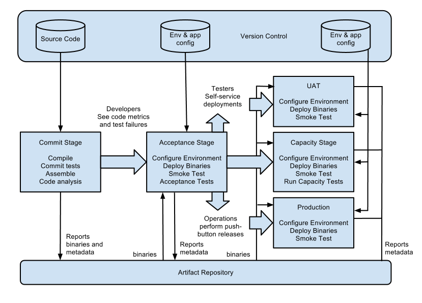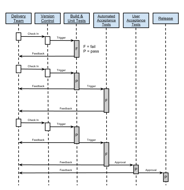 Der Begriff “Deployment-Pipeline” wirft Fragen auf: Wie sieht sie aus? Wie funktioniert sie? Was brauche ich, um eine zu bauen? Das Bild unten beantwortet mehrere dieser Fragen - Bilder sagen oft mehr als Worte.