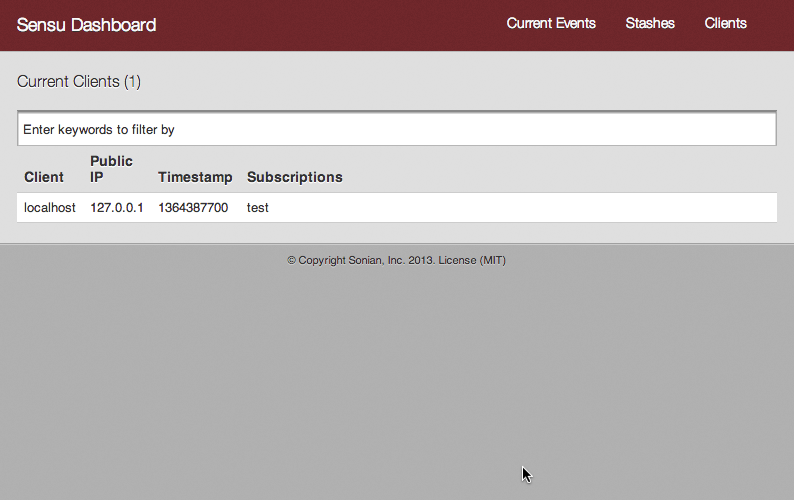 Ein einfacher Test, ob alles korrekt installiert wurde, ist, deinen Browser auf http://<deine_maschine>:8080/clients zu richten. Es sollte das Sensu-Dashboard mit einem verbundenen Client anzeigen.