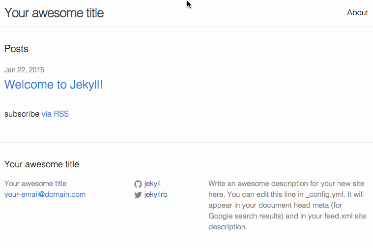 bundle exec jekyll serveNach diesen schnellen Schritten wurde mir diese schöne Homepage präsentiert: