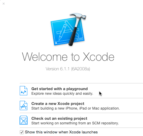 Lass uns loslegen: Starte Xcode und schreibe deinen ersten Core MIDI Code. Ich versuche auch, die meisten Beispiele in Xcode Playgrounds zu machen. Sie sind ziemlich angenehm zu benutzen und zu teilen. Wenn der Startbildschirm von Xcode erscheint, waehle einfach “Get started with a playground”.