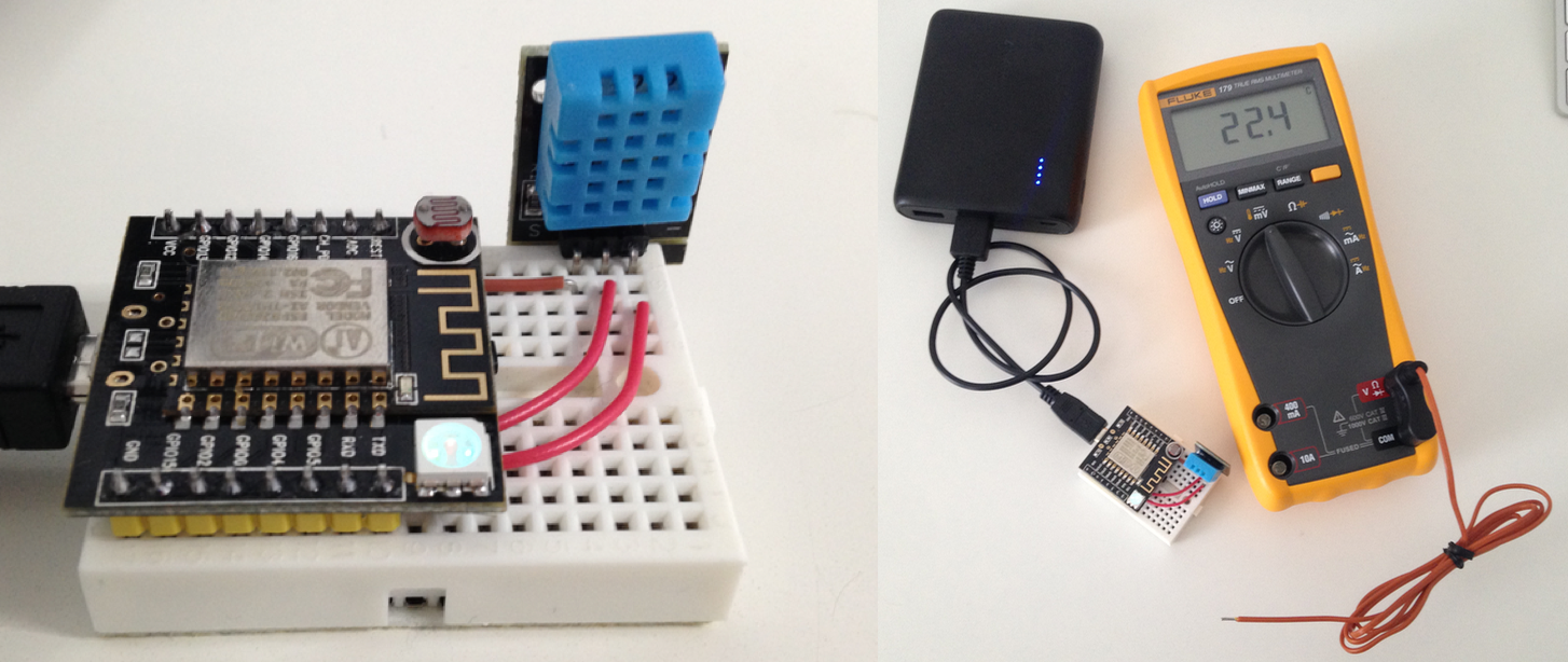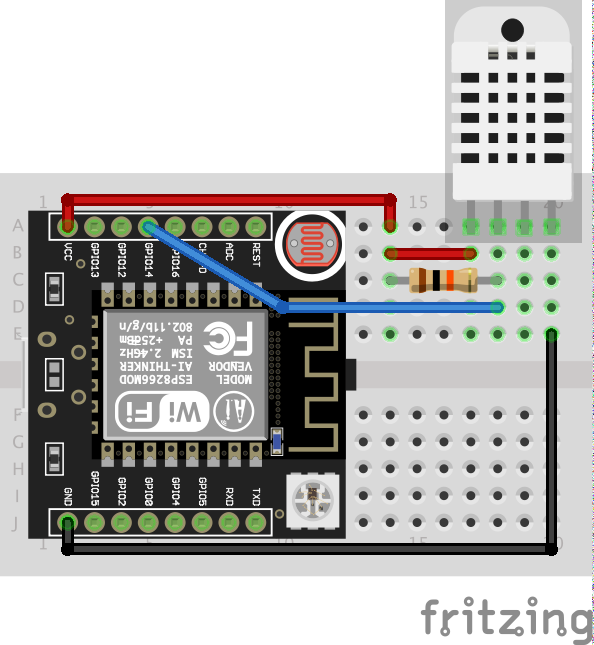 Dank der WiFi-Faehigkeiten des ESP8266 ist das nun unnoetig: Wir muessen nur den DHT11 anschliessen und etwas Code schreiben, um die Daten auszulesen und sie irgendwohin mit einem HTTP-Request oder Aehnlichem zu senden.