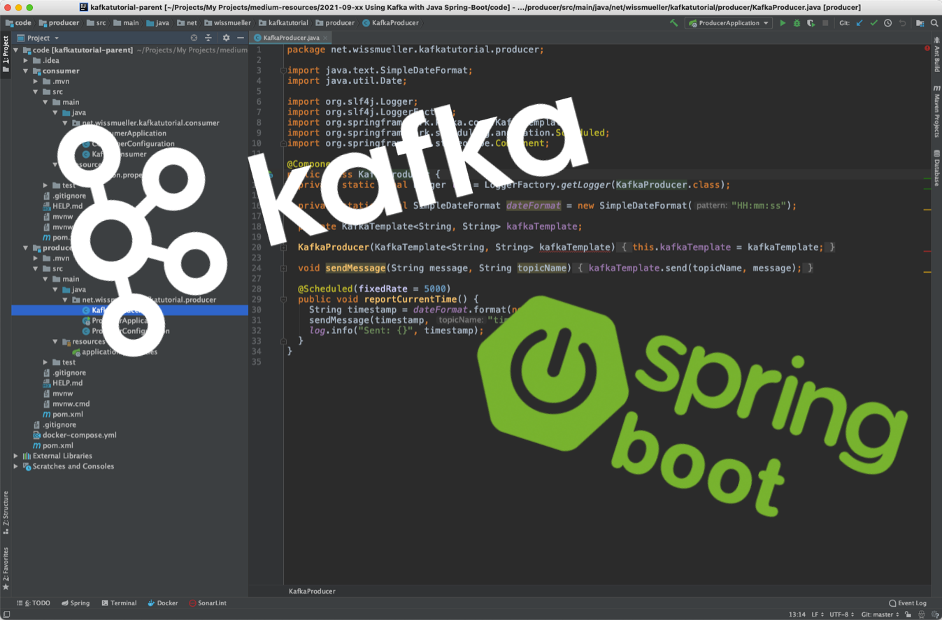 In reportCurrentTime() wird der Zeitstempel alle 5 Sekunden an Kafka gesendet, implementiert ueber die @Scheduled-Annotation. Dies funktioniert nur, wenn @EnableScheduling in der Application-Klasse gesetzt ist.