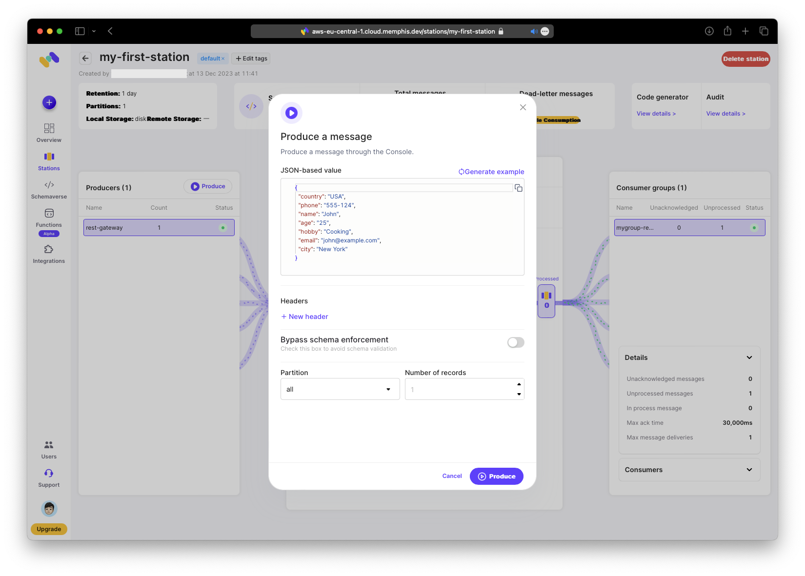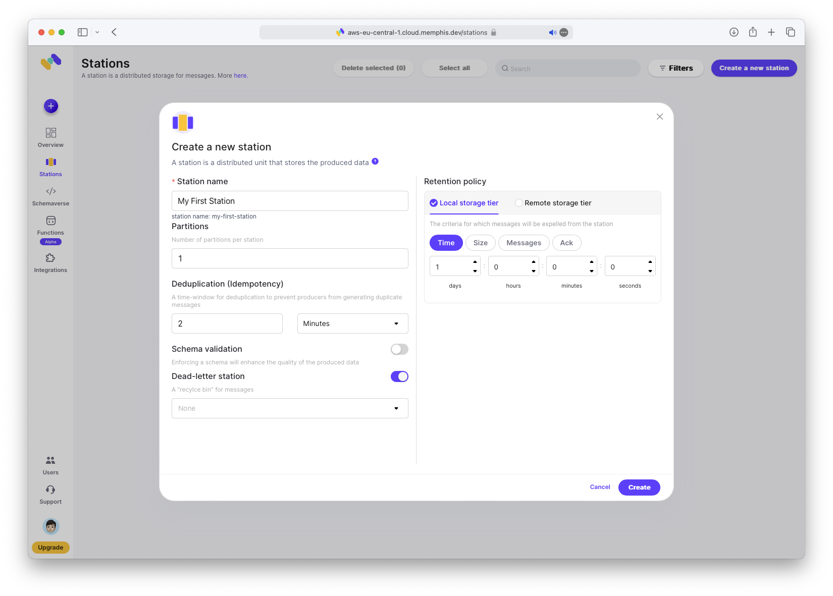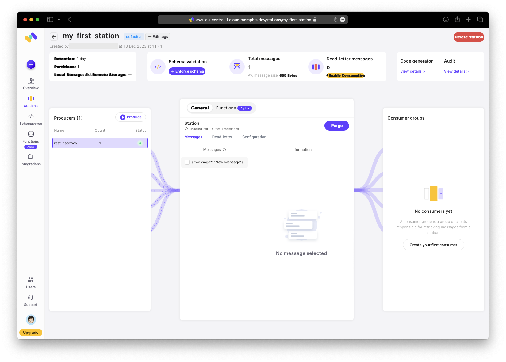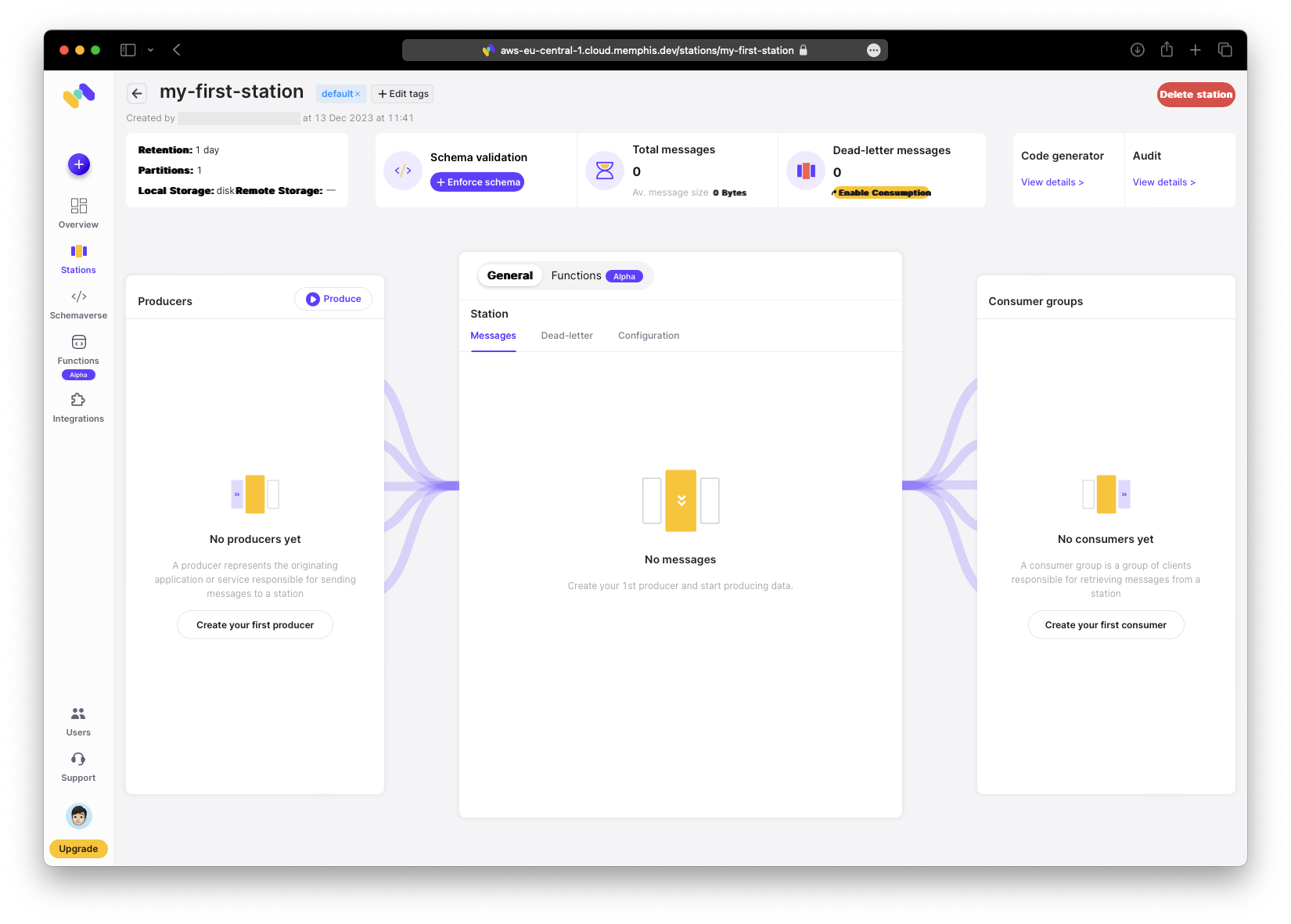 Als Naechstes erstelle die Station. Weitere Informationen zu Stations findest du in der Memphis Station Documentation. Wenn du Kafka-Erfahrung hast, wird dir das Konzept vertraut sein.