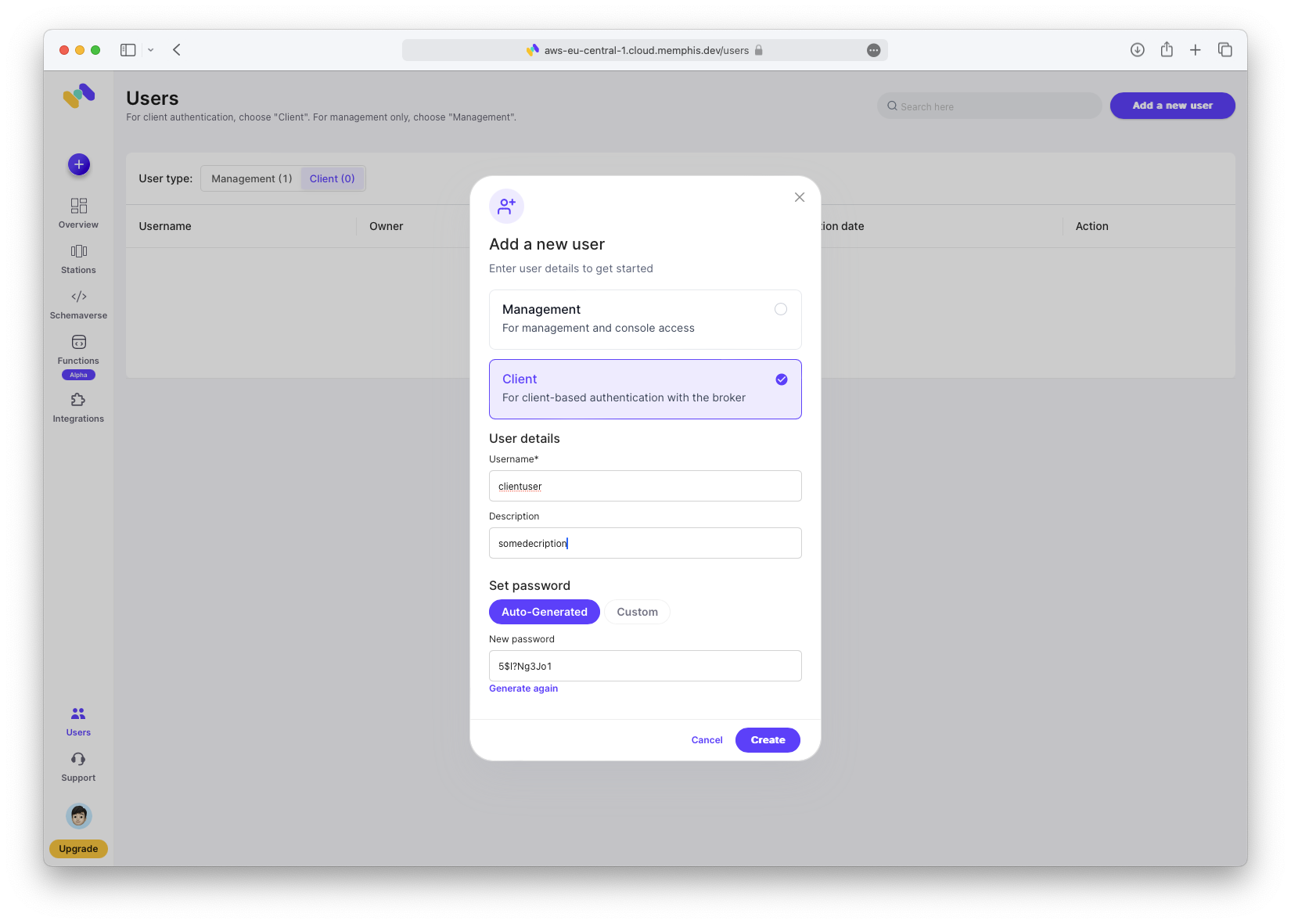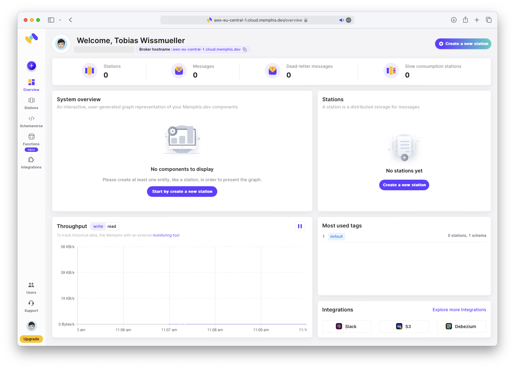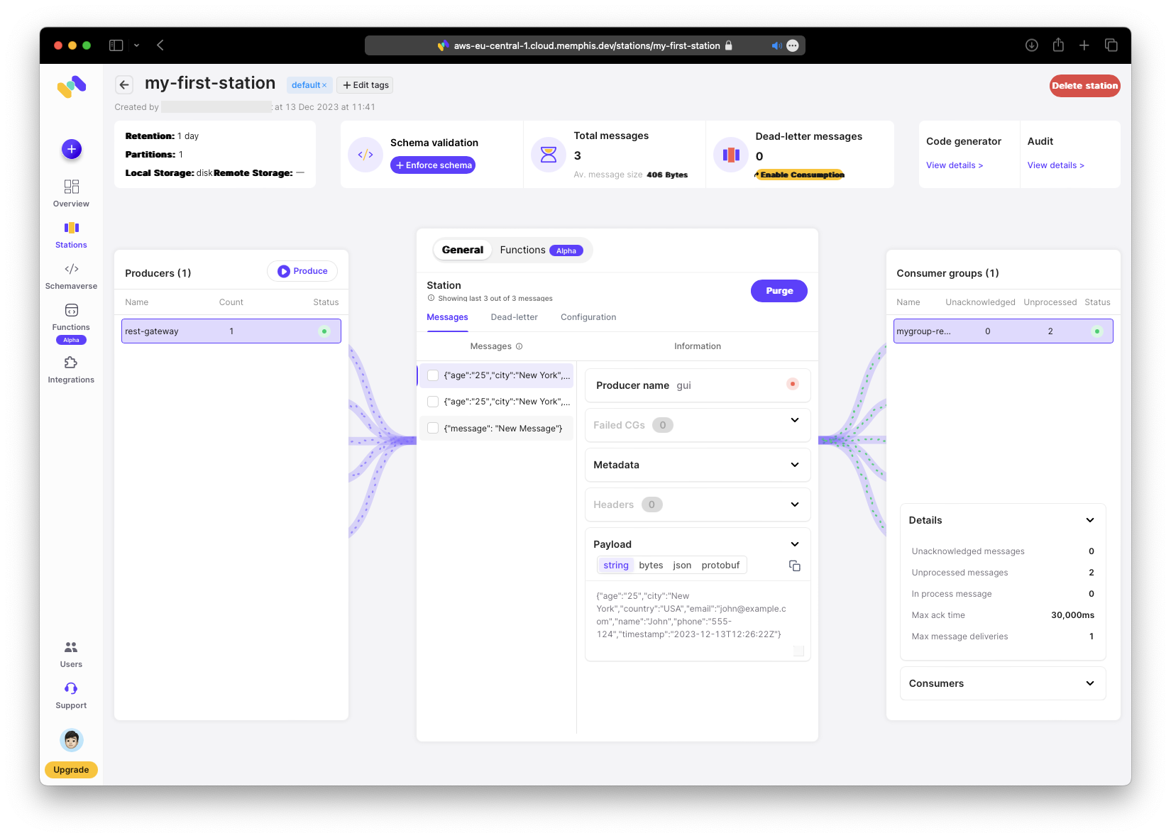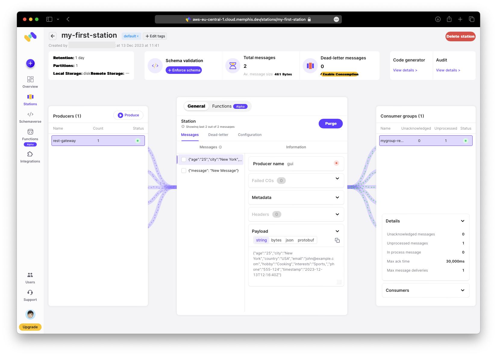 Als Naechstes erstelle die Station. Weitere Informationen zu Stations findest du in der Memphis Station Documentation. Wenn du Kafka-Erfahrung hast, wird dir das Konzept vertraut sein.