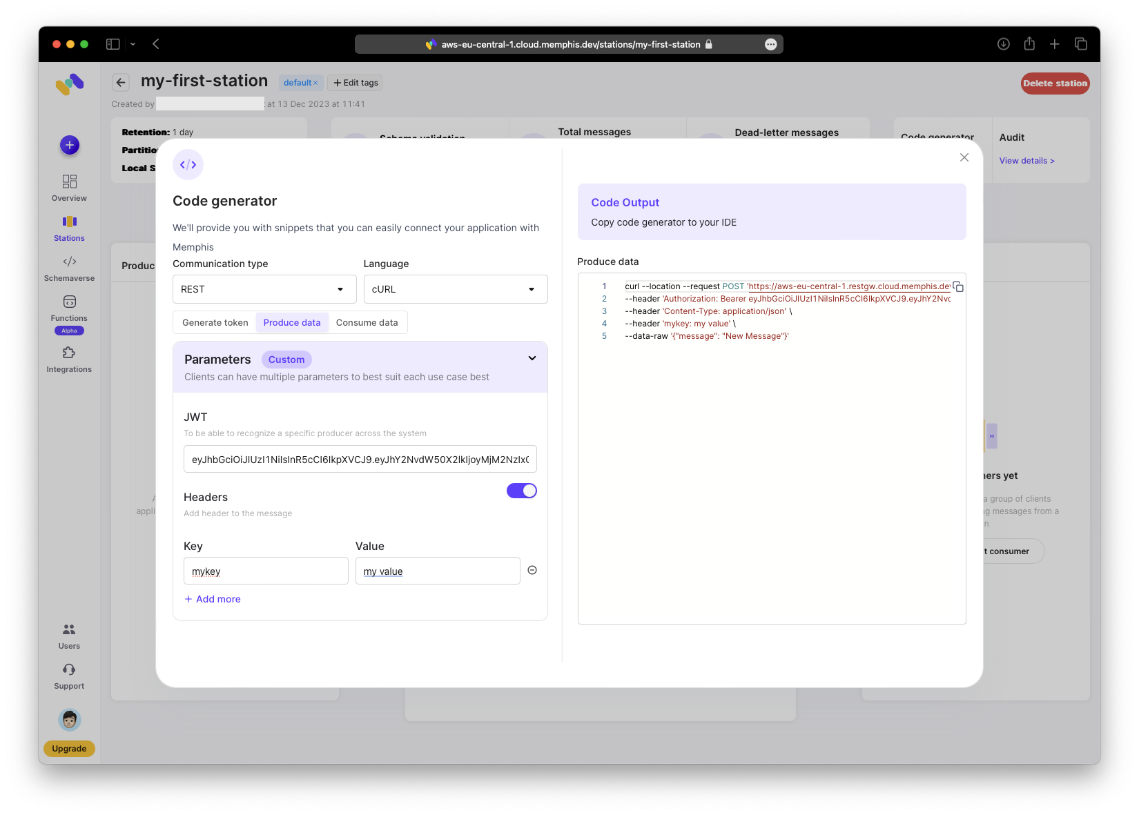 % curl --location --request POST 'https://aws-eu-central-1.restgw.cloud.memphis.dev/stations/my-first-station/produce/single' \