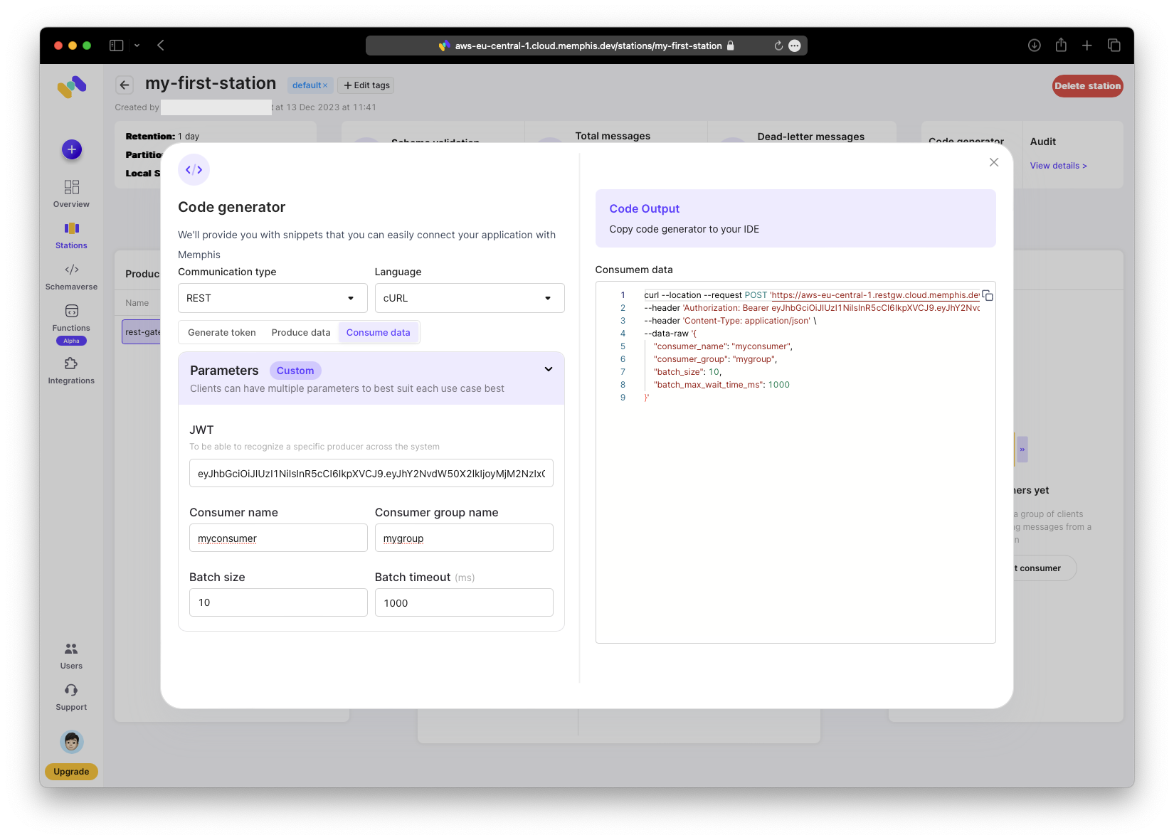 % curl --location --request POST 'https://aws-eu-central-1.restgw.cloud.memphis.dev/stations/my-first-station/consume/batch' \