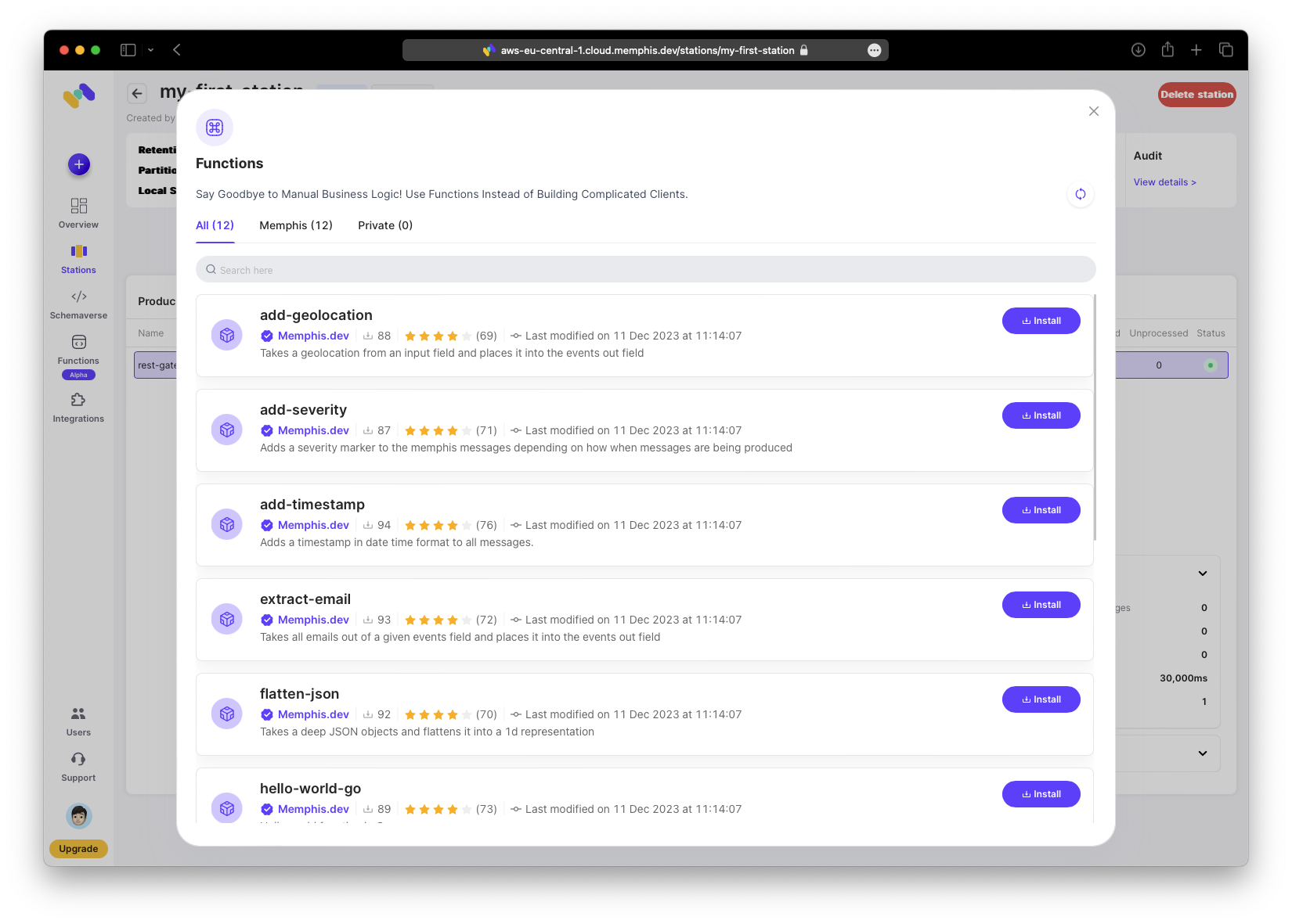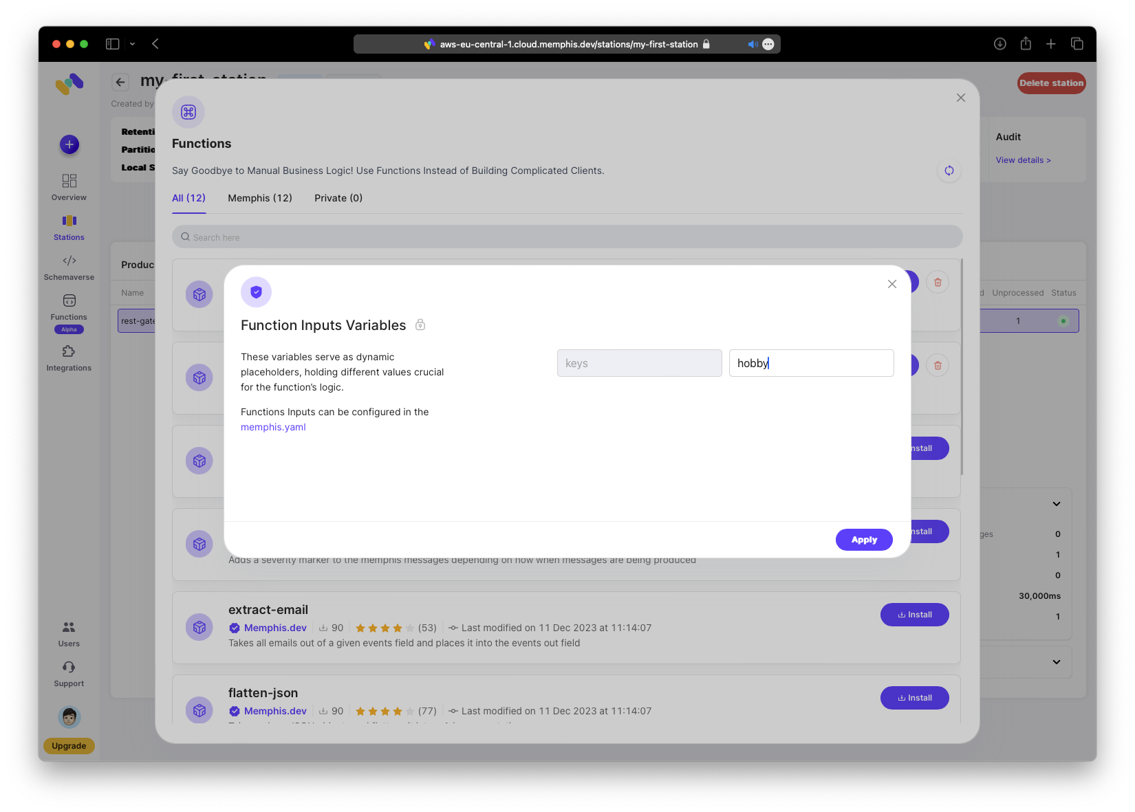 Der wichtige Teil fuer mich ist die Moeglichkeit, Daten zu manipulieren, bevor Consumer Nachrichten erhalten. Memphis bietet mehrere nuetzliche eingebaute Funktionen, die du anpassen kannst. Alternativ kannst du deine eigenen Funktionen in einem GitHub-Repository definieren, das du kontrollierst, und es mit deinem Memphis-Konto verknuepfen.