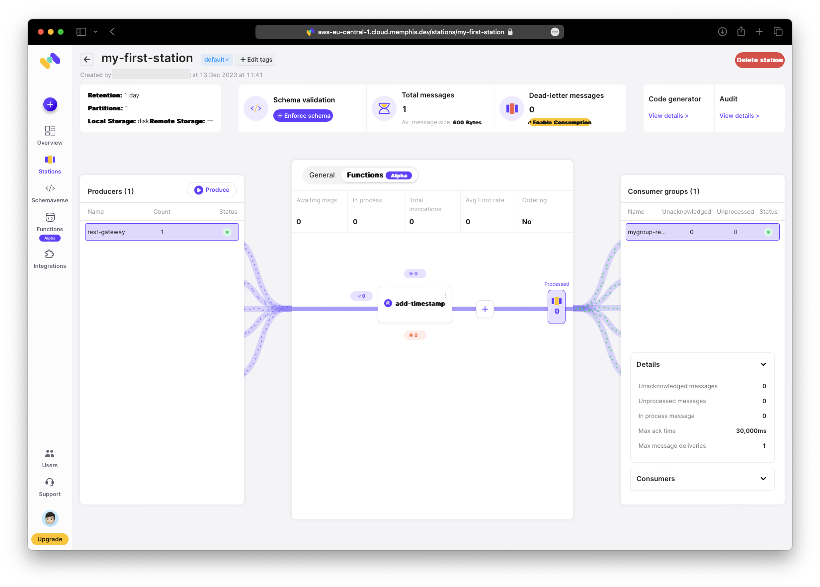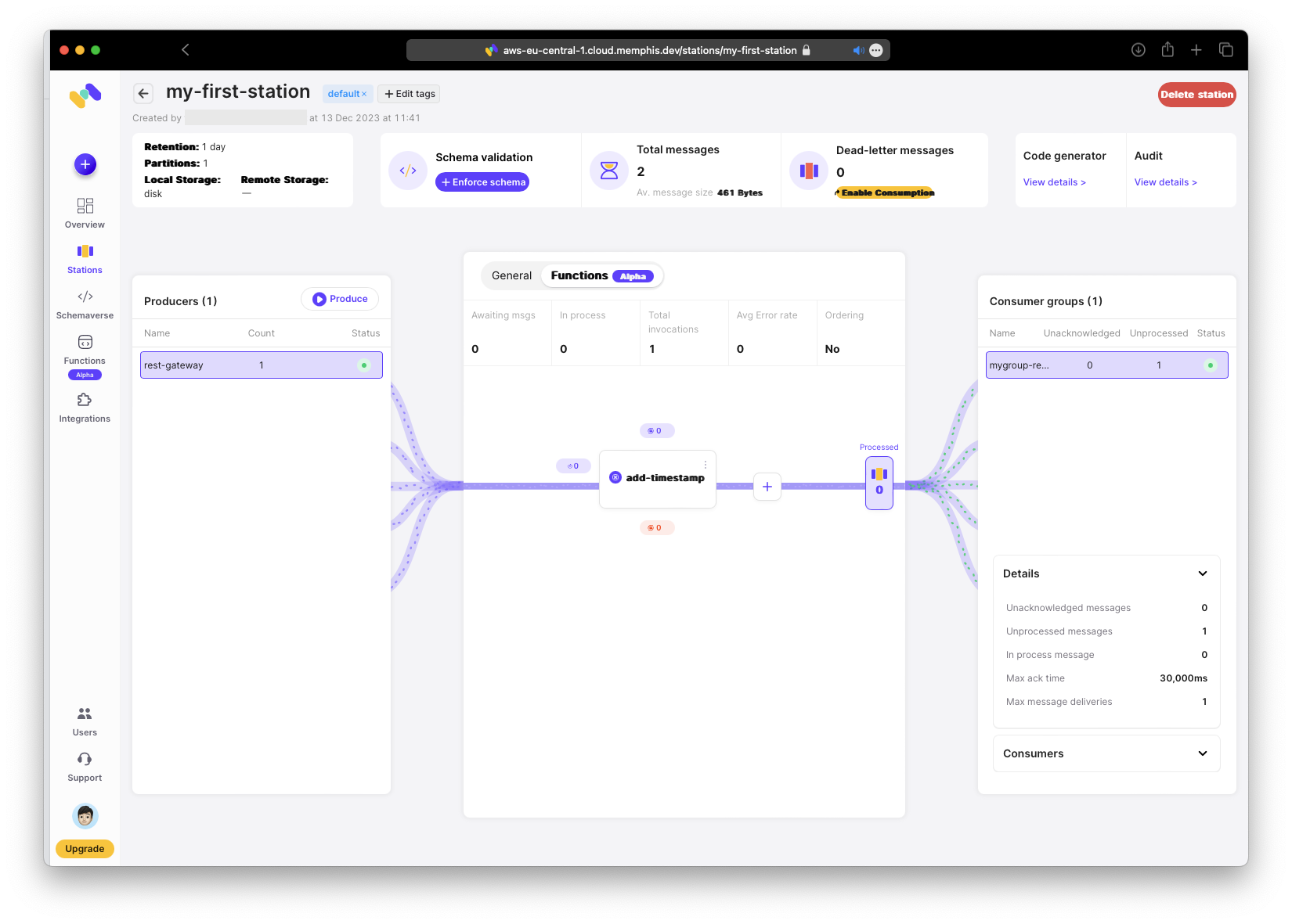 Waehrend AWS der dominierende Anbieter ist, finde ich ihre Web-UI oft kompliziert - besonders beim Prototyping und wenn man ohne das AWS SDK herumklicken moechte. Ich moechte etwas Einfaches und Exploratives. Ich habe moeglicherweise eine solche Loesung mit memphis.dev gefunden, die kuerzlich ihr “Functions”-Angebot veroeffentlicht haben. Mit Memphis erstellst du eine “Station” (aehnlich einem Kafka Topic) und kannst eine Datenpipeline visuell definieren. Stations haben Producer und Consumer.